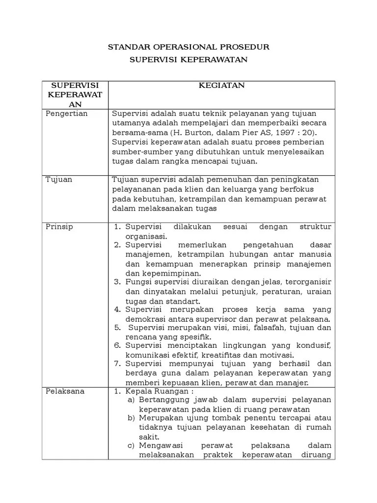 Kepala ruangan mengawasi perawat pelaksana dalam memberikan asuhan keperawatan baik secara langsung maupun tidak langsung disesuaikan dengan metode penugasan . 2) supervisi berfungsi untuk kelancaran pelaksanaan proses pembelajaran di sekolah untuk mencapai tujuan hasil yang . Ini berarti bahwa tujuan supervisi tidak hanya untuk memperbaiki . Instrumen penelitian yang digunakan adalah kuesioner. Supervisi belum dilakukan keseluruh area yang seharusnya.
